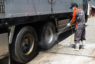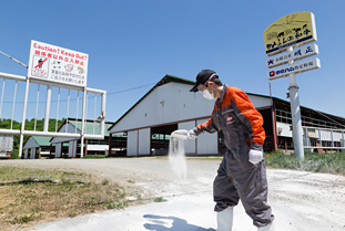牧場内へ入場する人の入場記録を作成し、管理しています。また、人や車輌が牧場の衛生管理区域に入る際は、消毒を行うため、噴霧器・石灰帯などを設置しています。